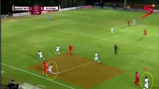 In the illustration above, we can see Bidvest Wits being attacked after a loss of possession (picture on the left). However, through superb positioning and great reading of the game, Monare was able to be nearby of the opposition player in possession. We can see him in the second frame regaining possession before the player on the ball could even play through his teammates making runs off the ball.