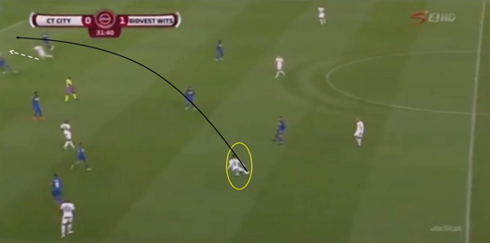In the illustration above, we can see him looking to locate his teammate that is making a run off the shoulder of the last man. An 88% pass success rate is usually associated with players that play safe and short passes. In the case of Monare, we see a player who is looking to be aggressive with ball possession. Whenever he regains possession, and the moment is right he looks to start attacks using his decent long-range passing ability.