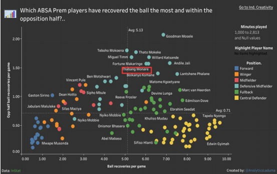 Thabang Monare recorded 76 successful tackles and 124 successful interceptions [Data: @mba_lm], translating to 60% successful defensive actions in the entirety of the 2019/20 PSL season. He further recovered a total of 149 balls, 46 of them being in the opposition half. The scatter-plot below shows how the before mentioned numbers compare against other players in the ABSA Premiership, in terms of most balls recovered per game and within the opposition half.